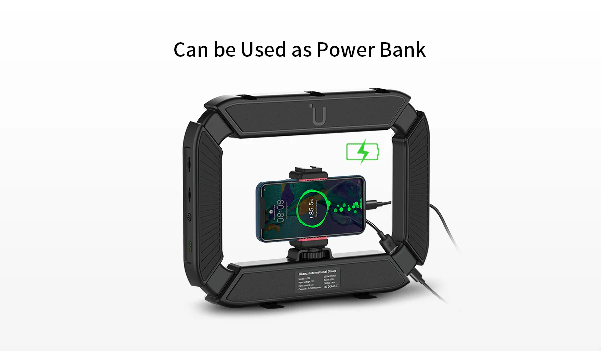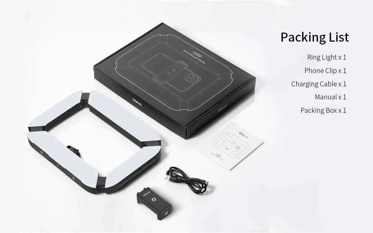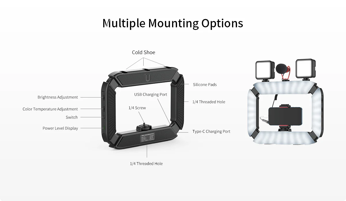 It houses 200 LEDs per panel (three panels total) to evenly light your subject up to 7 meters away. The internal 8000 mAh battery powers the light continuously for up to 10 hours and even offers a USB port inside the ring to charge your phone. Mount your gear easily using the included phone/camera holder, plus multiple ISO and ¼″ threaded mounts.